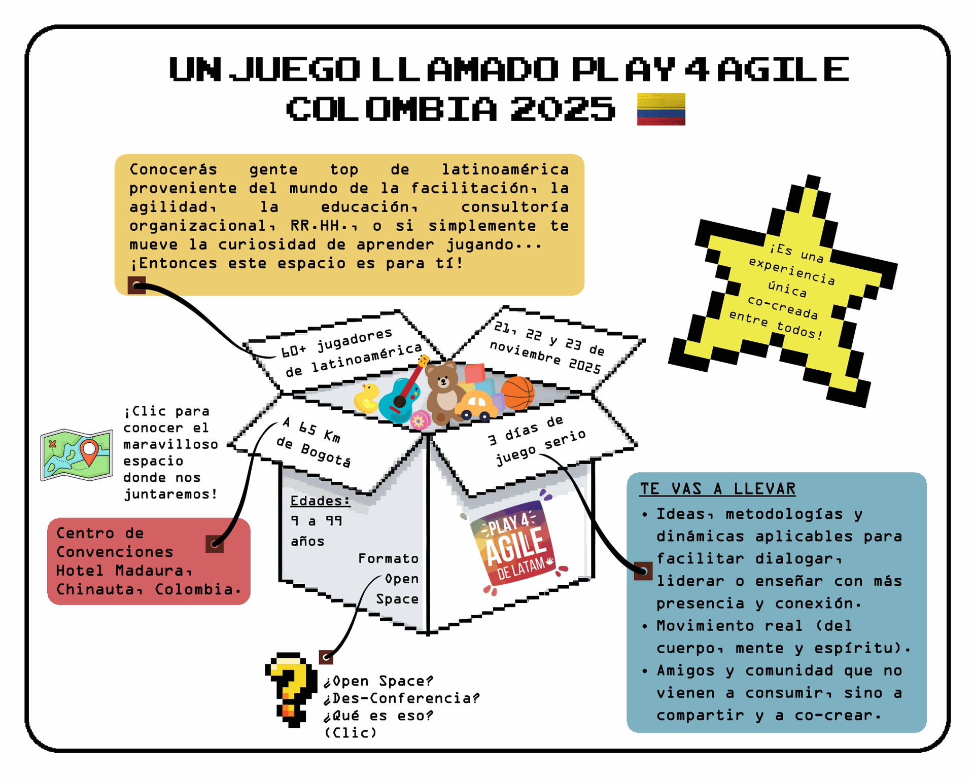 Más que un evento, es una aventura creativa e inspiradora que invita a “jugar en serio” para aprender, explorar y crear nuevas formas de colaboración y crecimiento.
