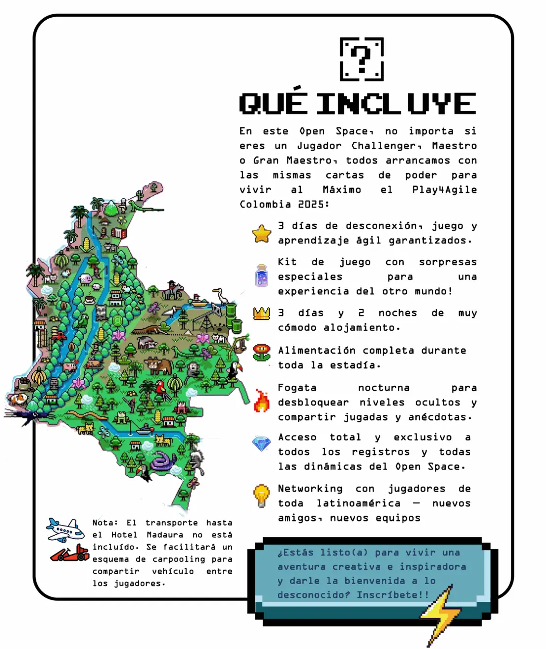 - Kit de juego con sorpresas especiales, alojamiento cómodo por 2 noches, alimentación completa, dinámicas de Open Space y actividades nocturnas como fogatas para compartir experiencias.